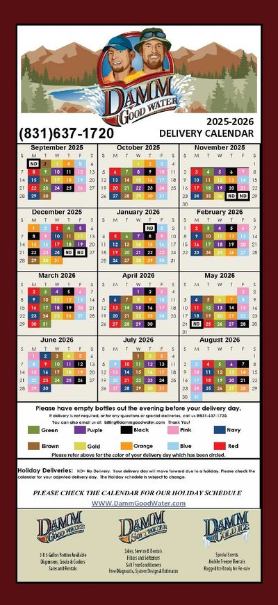 Once you become part of the Damm Good Water family, you'll be assigned a route color and will receive a hard copy of the delivery calendar. Your water will be delivered every two weeks unless other arrangements made with us.